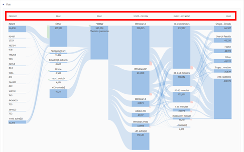 | Visualisation de flux | Grâce à la nouvelle fonction de flux, vous pouvez suivre le flux/parcours des clients dans vos sites et applications au moyen de nouvelles visualisations flexibles dans Analysis Workspace, afin de découvrir de quelle façon se déplacent les clients et progressent dans vos sites et applications. Grâce au flux, vous pouvez :