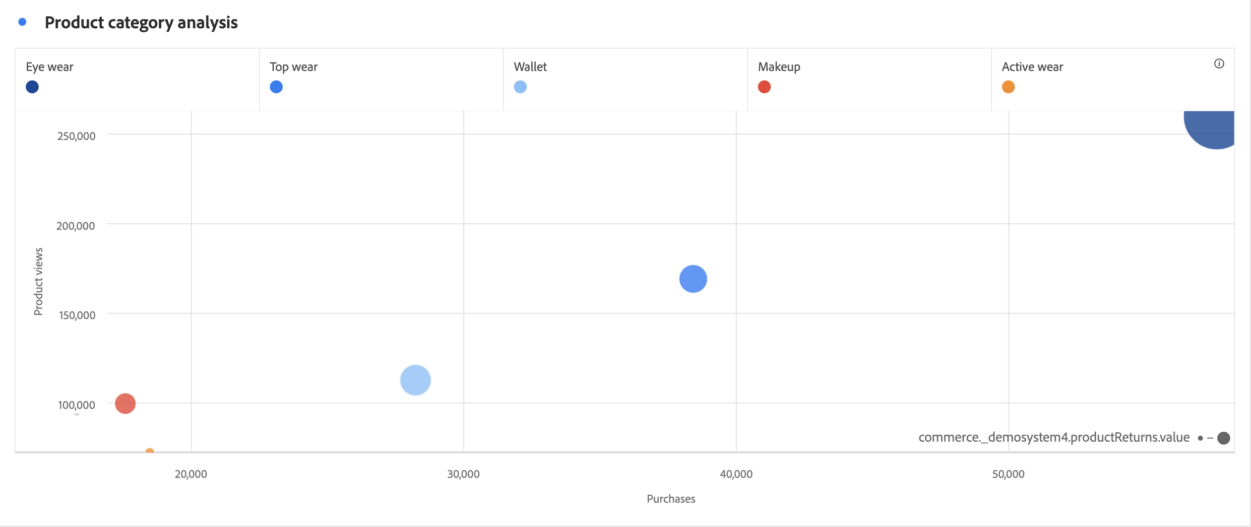 Présente les impressions diffusées et le nombre d’utilisateurs uniques qui ont vu ces impressions. La taille de chaque point de données fournit une indication visuelle du nombre de fois moyen auquel un observateur a été exposé à une publicité. La taille et les données varient selon les dimensions, les périodes et les filtres que vous sélectionnez.