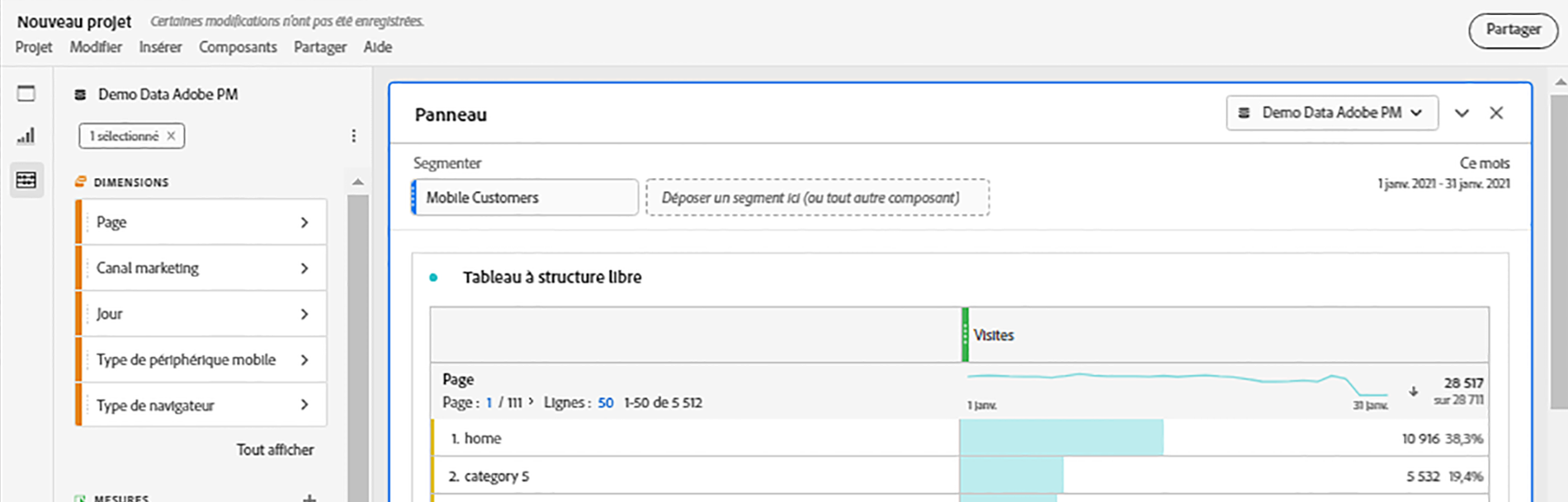 Lorsque vous créez un panneau, la suite de rapports par défaut est basée sur la suite de rapports du panneau sur lequel vous avez travaillé pour la dernière fois dans le projet Analysis Workspace.