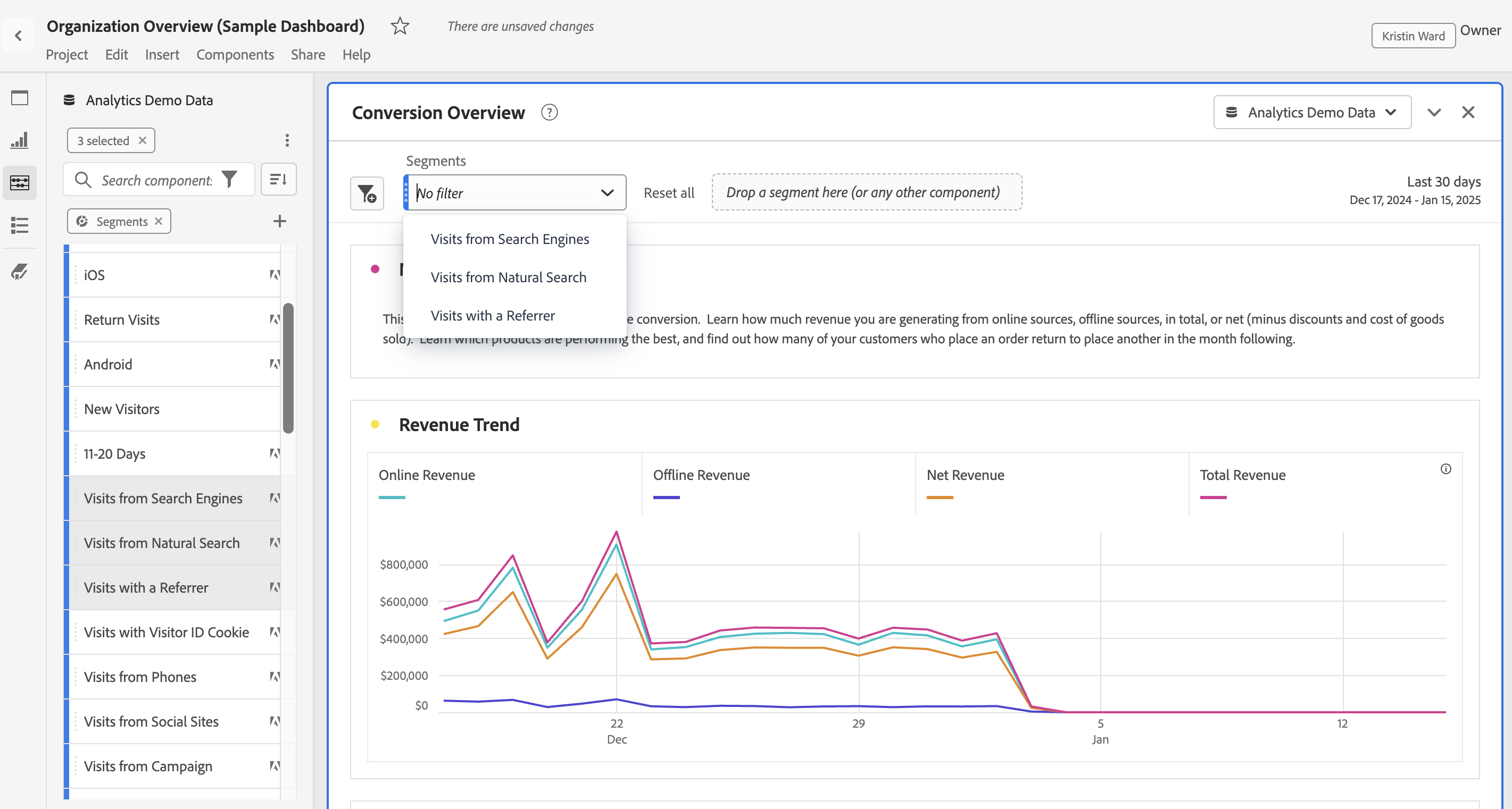 Per i segmenti a discesa che utilizzano un mix di componenti (ad esempio 2 metriche e 3 segmenti), seleziona più componenti utilizzando ⇧ +