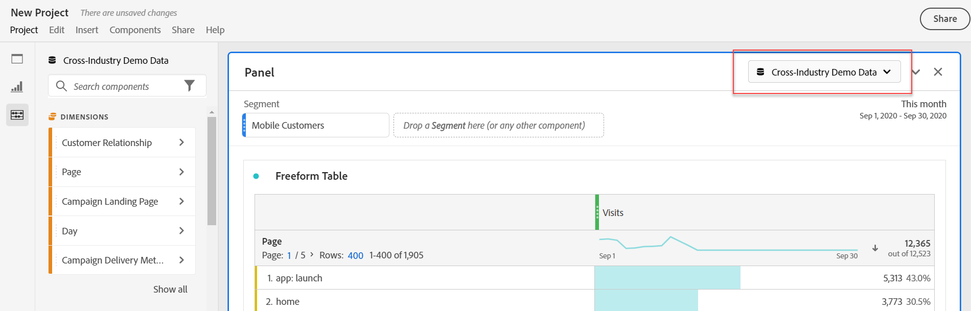 Un panel è una raccolta di tabelle e visualizzazioni. Puoi accedere ai pannelli dall’icona in alto a sinistra in Workspace o da un pannello vuoto. I pannelli sono utili per organizzare i progetti in base a specifici periodi di tempo, suite di rapporti o casi di utilizzo di analisi.