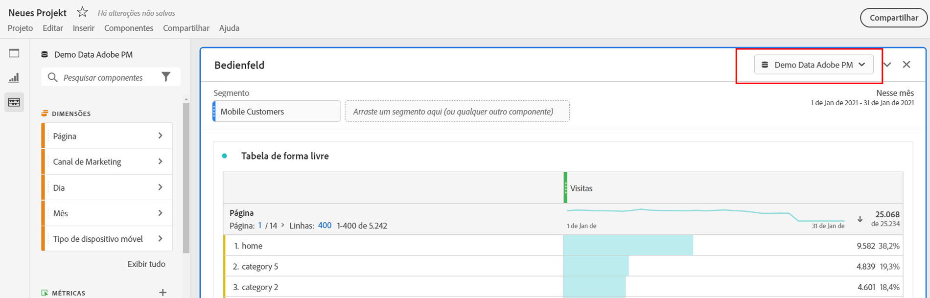 Ao criar um novo painel, o conjunto de relatórios padrão se baseia no conjunto de relatórios do painel que você utilizou pela última vez no projeto do Analysis Workspace.