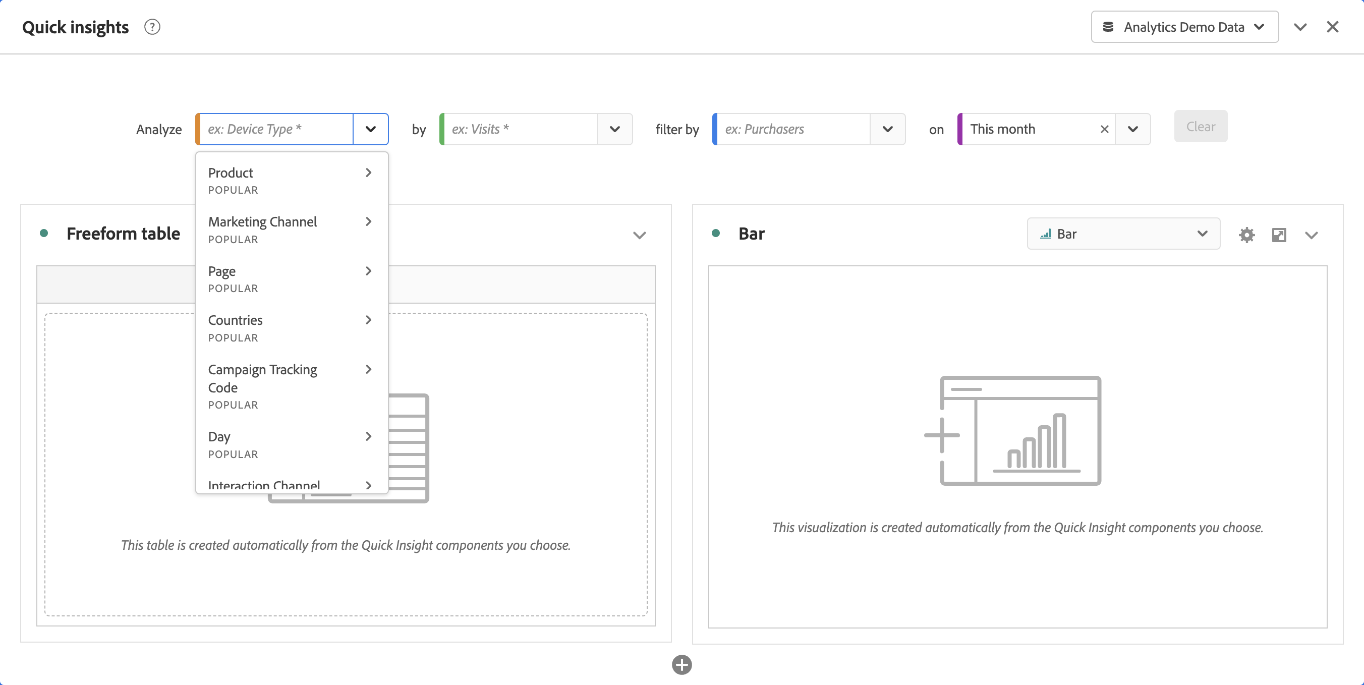 Quick Insights fournit des conseils aux non-analystes et aux nouveaux utilisateurs d’Analysis Workspace pour savoir comment répondre rapidement et facilement à des besoins professionnels. Il s’agit également d’un outil idéal pour les utilisateurs expérimentés qui souhaitent une réponse rapide à une question simple sans avoir à créer eux-mêmes un tableau.