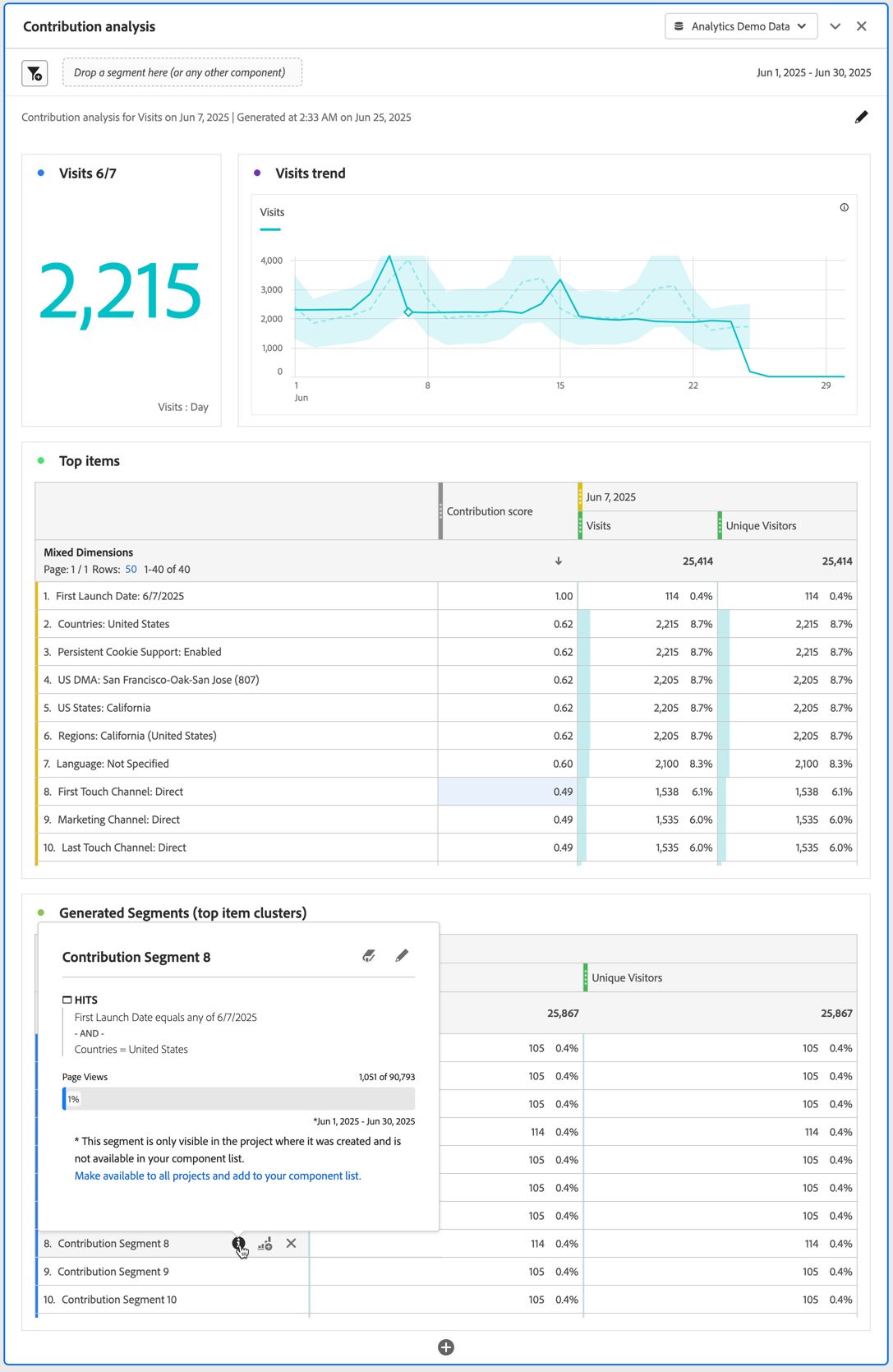 Le tableau Segments générés (grappes des principaux éléments) identifie les associations des principaux éléments en fonction de la note de contribution, des occurrences de l’anomalie et du pourcentage global contribuant à la mesure anormale. Ces données sont ensuite regroupées dans un segment d’audience (Segment de contribution 1, Segment de contribution 2, etc.). Cliquez sur le bouton « i » (informations) pour afficher une définition de chaque segment automatique, y compris les principaux éléments qui le composent :