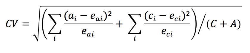 표 1에서는 Cramer의 V를 사용하여 기간 1 (예: 히스토리)과 기간 2 (예: 예외 항목이 발생한 날)에 대한 국가별 페이지 보기 횟수 간 연관성을 측정할 수 있습니다. Cramer의 V에 대한 낮은 값은 낮은 수준의 연관성을 나타냅니다. Cramer의 V 범위는 0 (연관성이 없음) ~ 1 (완전한 연관성)입니다. Cramer의 V 통계를 다음과 같이 계산할 수 있습니다.