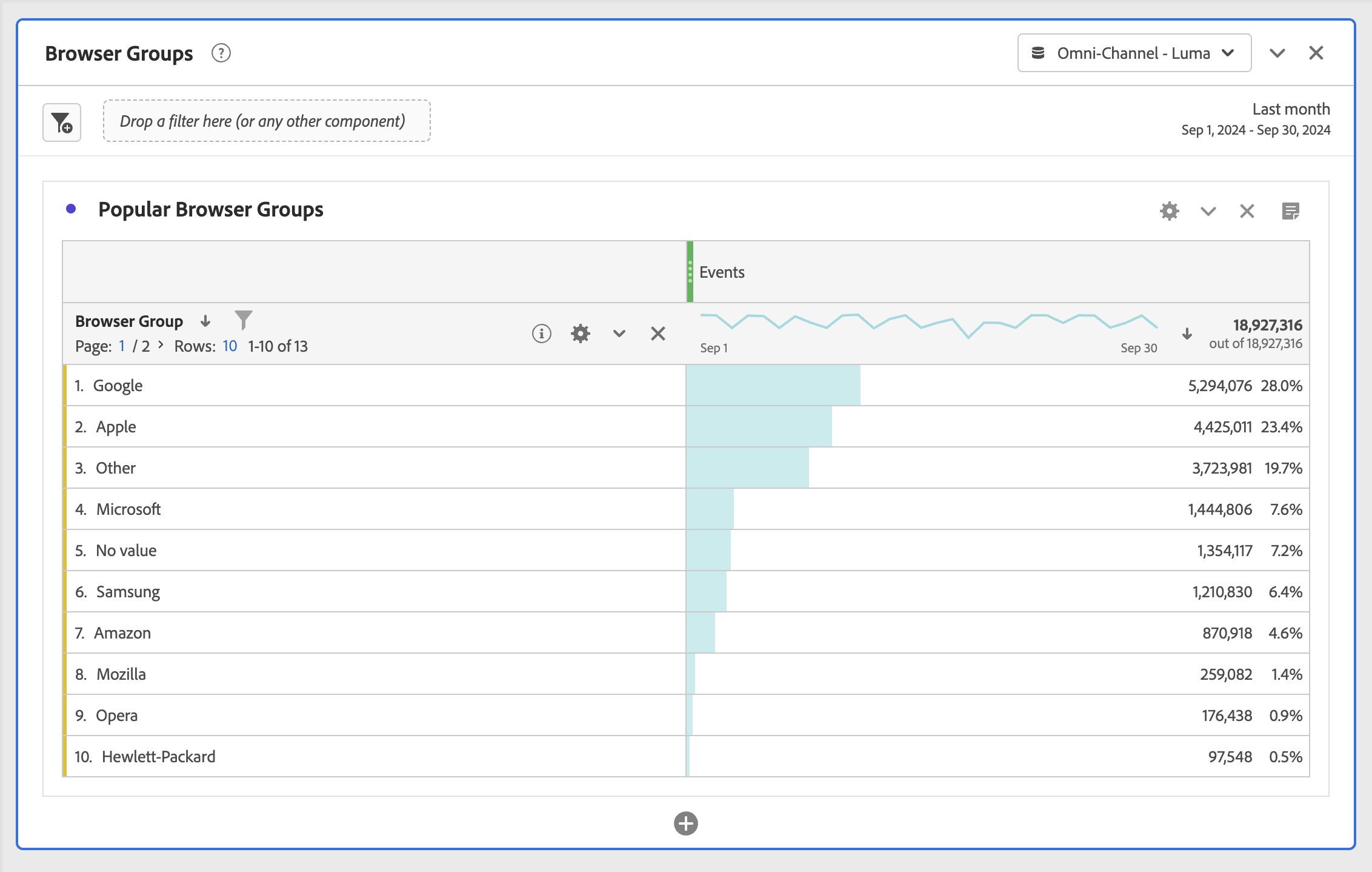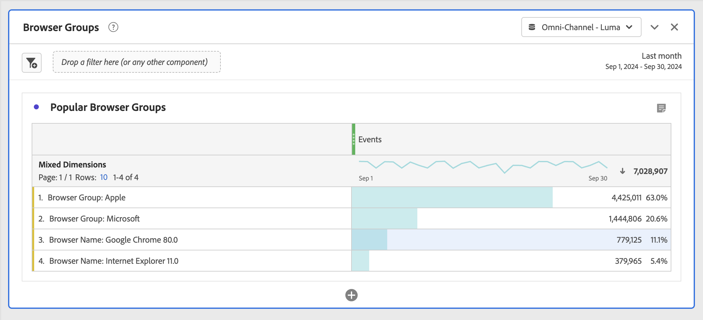 예를 들어 Microsoft나 Apple과 같은 특정 브라우저 유형 항목 위로 드래그하면 그 2개의 특정 항목이 항상 테이블에 표시되게 됩니다.