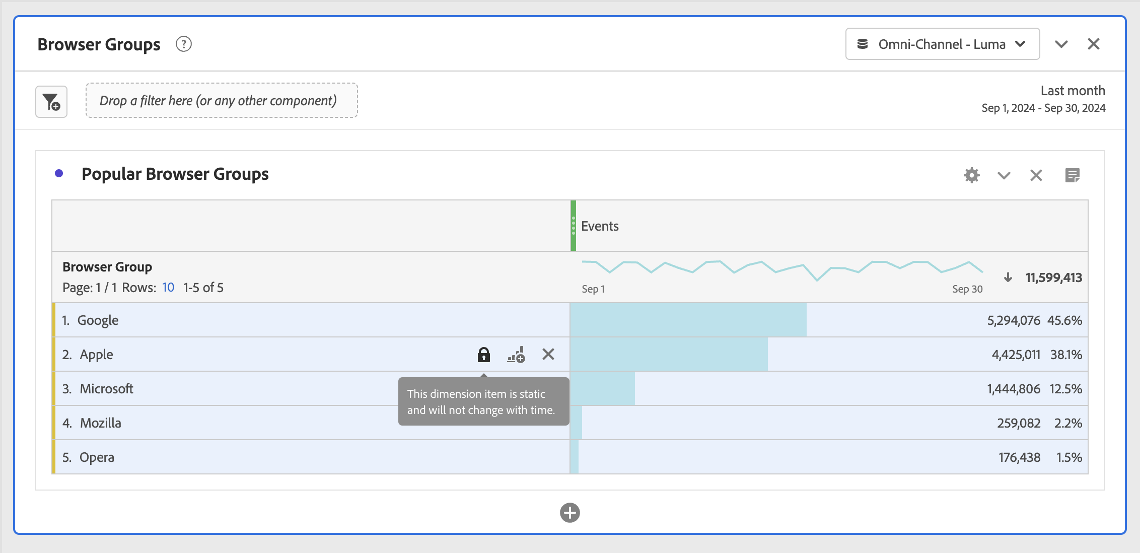 정적 차원 항목에는 행 필터 옵션이 없습니다. 대신 각 항목에 자물쇠와 X 아이콘이 표시됩니다. 테이블에서 해당 차원 항목을 제거하려면 X 아이콘을 클릭하십시오.