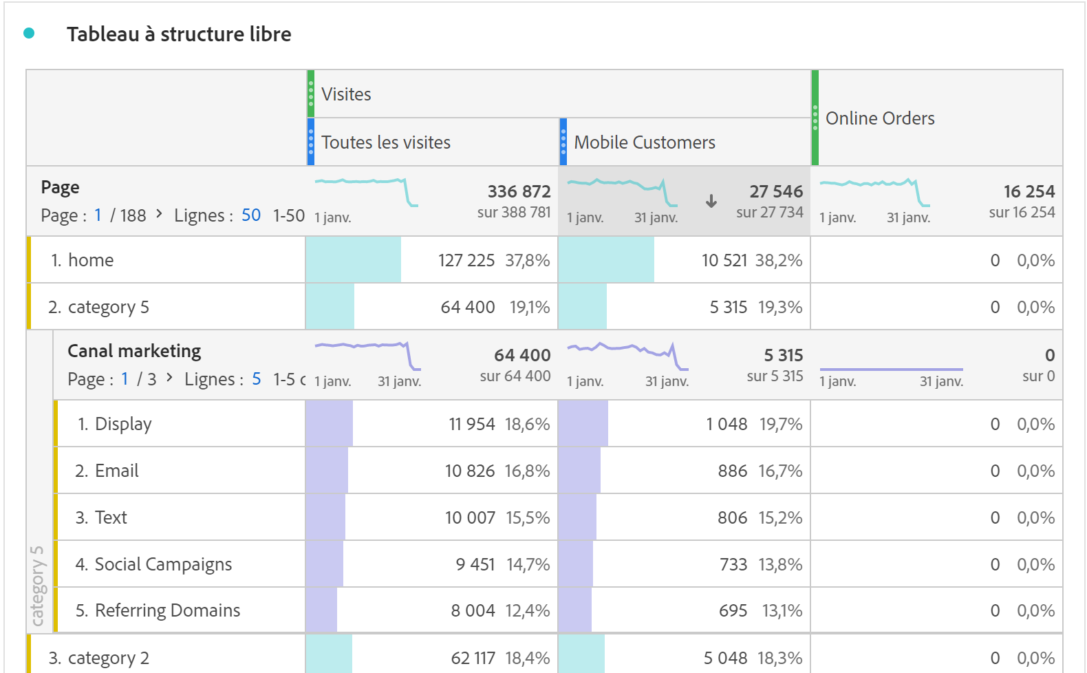 Dans Analysis Workspace, un tableau à structure libre est la base de l’analyse de données interactive. Vous pouvez faire glisser et déposer un ensemble de composants dans les lignes et les colonnes afin de créer un tableau personnalisé pour votre analyse. Lorsque chaque composant est déposé, le tableau est mis à jour immédiatement afin que vous puissiez effectuer rapidement une analyse en profondeur.