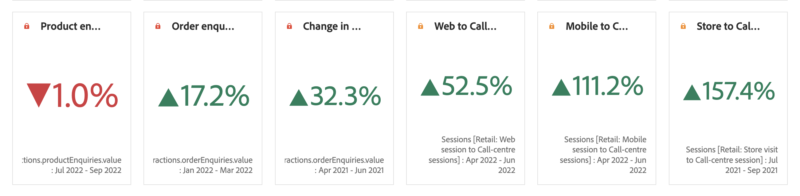 요약 변경 시각화를 사용하여 두 숫자 간의 델타(변화량)를 표시합니다. 요약 변경의 녹색 및 빨간색 색상은 사용자 지정 이벤트 극성 또는 계산된 지표의 증가 트렌드를 다른 방식으로 표시 옵션을 통해 제어할 수 있습니다.