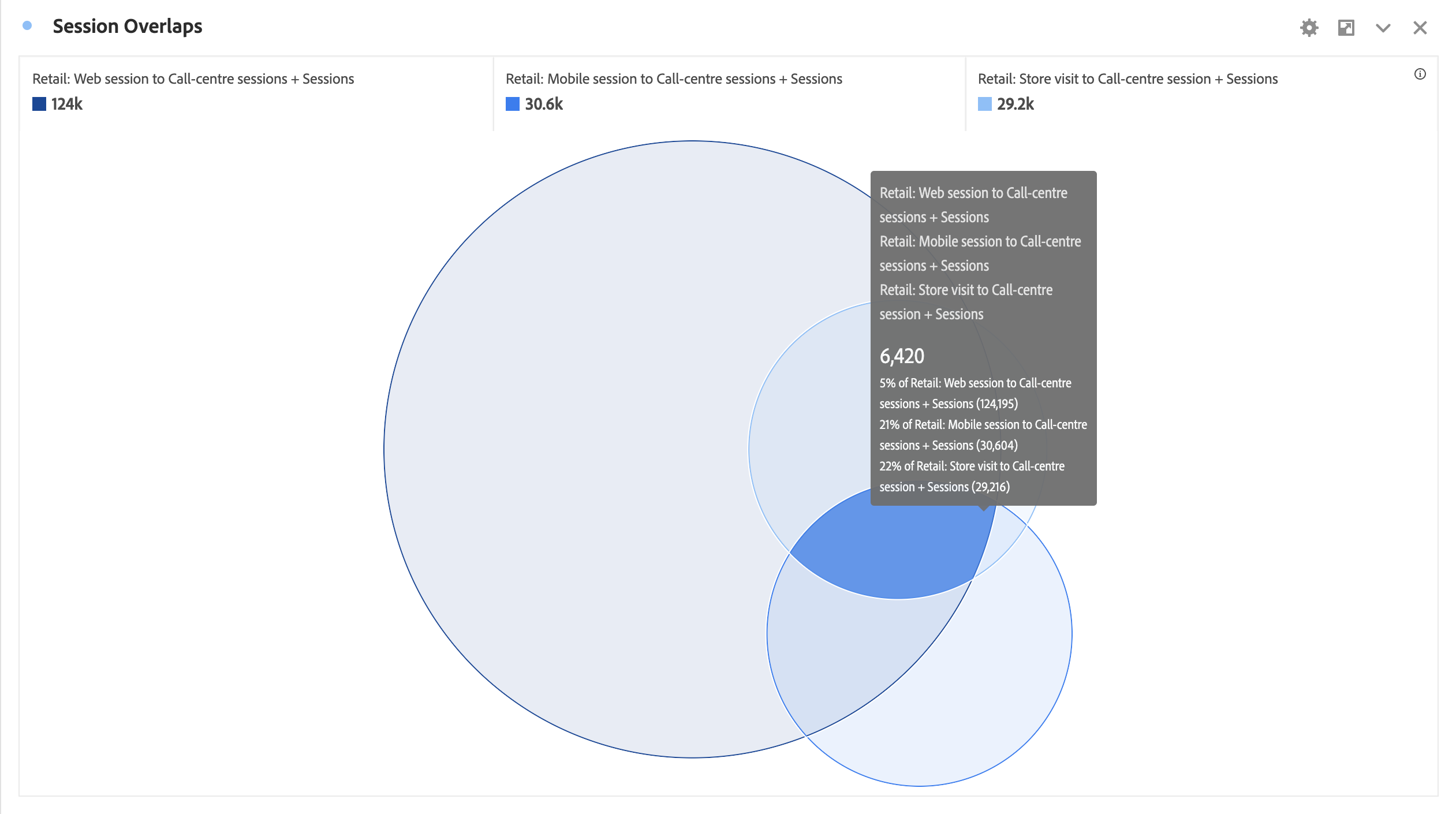 벤 시각화를 사용하면 최대 3개의 세그먼트(구성에서) 및 한 개 지표를 드래그해서 벤 다이어그램을 작성할 수 있습니다.
