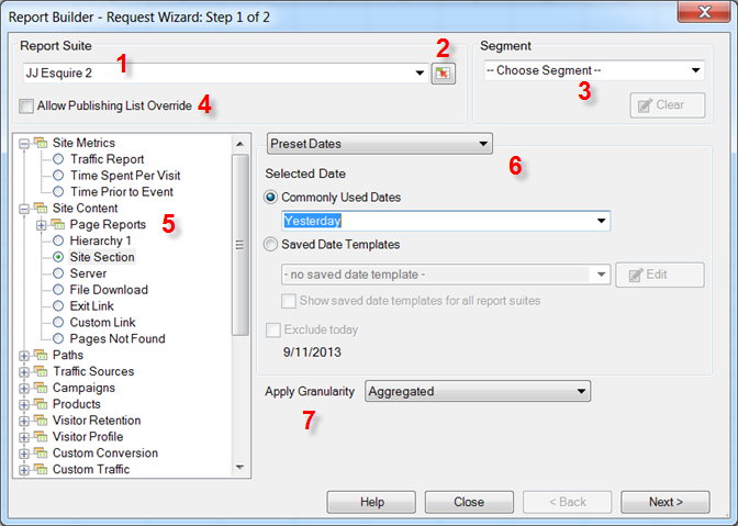 요청 마법사 1단계 양식에서는 보고서 세트, 보고서 유형, 세그먼트를 선택하고 날짜를 구성합니다.