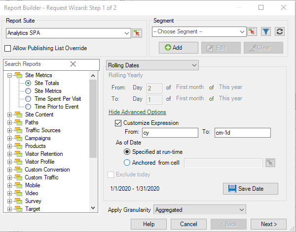 고급 옵션을 사용하여 사용자 지정 날짜 표현식을 혼합하고 일치시킬 수 있습니다. 예를 들어 해당 연도의 첫 번째부터 마지막 전체 달 말까지 데이터를 보려는 경우 다음을 입력할 수 있습니다. From: cy To: cm-1d 마법사에서 해당 날짜가 1/1/2020-1/31/2020으로 표시됩니다.
