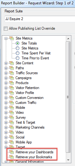 Tous les rapports mis en signet et de tableau de bord sont désormais répertoriés en tant que dimensions à l’étape 1 de l’Assistant Requête et peuvent être importés en tant que requêtes de Report Builder.