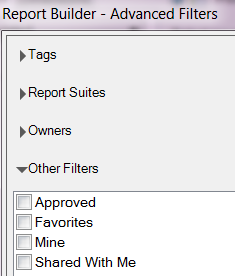 | Suites de rapports | Si vous appliquez le filtre « Uniquement le nom de la suite de rapports » dans le Créateur de mesures calculées dans Reports & Analytics, puis affichez le filtre avancé dans Report Builder, le filtre avancé affiche uniquement les mesures calculées correspondant à la suite de rapports sélectionnée. |