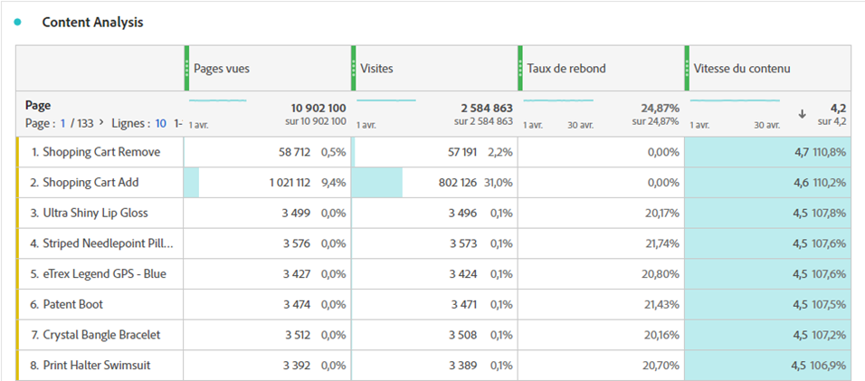 La « vitesse du contenu » est un modèle de mesure calculée qui permet de mesurer l’impact d’une dimension sur le contenu en aval. Elle utilise la formule Page views (Visit participation) divided by Visits.
