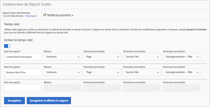 La configuration des rapports en temps réel dans les Reports & Analytics consiste à sélectionner la suite de rapports et à configurer jusqu’à trois rapports pour cette suite.