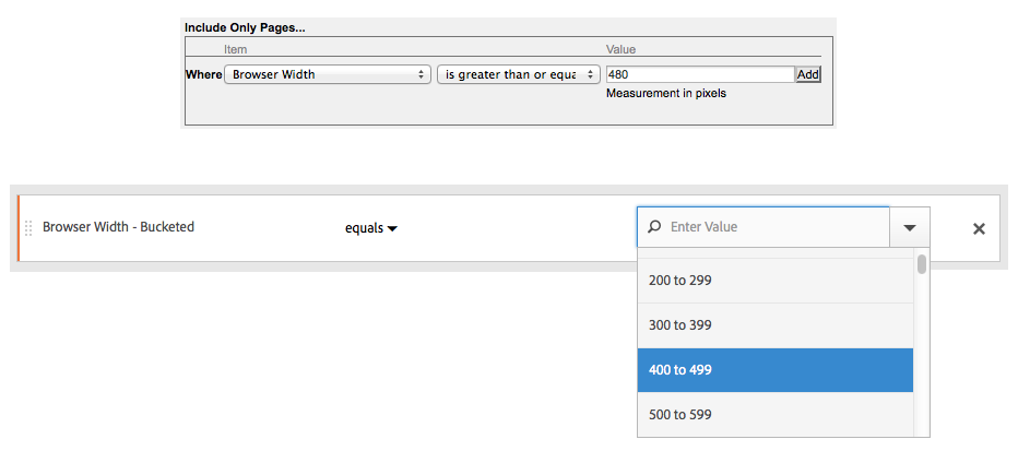 알려진 값 세트를 갖는 정수 기반 차원 (예: 브라우저 너비)은 열거형 범위로 분할되었으므로 특정 범위의 세그먼트를 빠르게 정의할 수 있습니다. 이러한 열거된 목록은 차원 이름 뒤에 " - Bucketed"가 붙습니다. 다음 화면은 이러한 차원이 이전 및 새 세그먼트 빌더 인터페이스를 사용하여 세그먼트화되는 방식을 보여 줍니다.