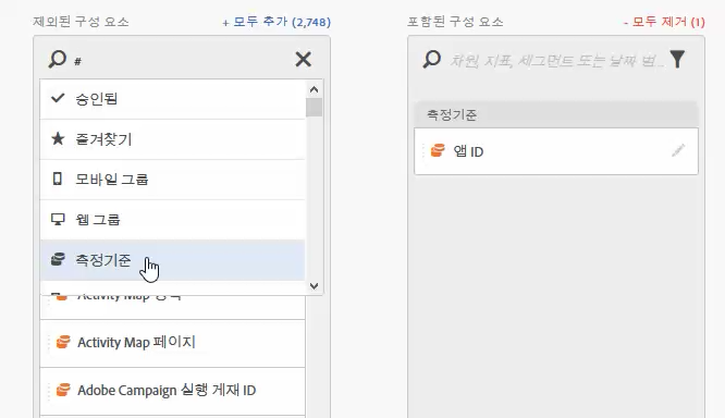 또한 모두 추가를 클릭하여 구성 요소를 필터링하거나 검색하고 필터링된 전체 선택을 포함된 열에 추가할 수 있습니다.