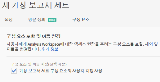 Analytics > 구성 요소 > 가상 보고서 세트 > 새 가상 보고서 세트 만들기로 이동합니다.