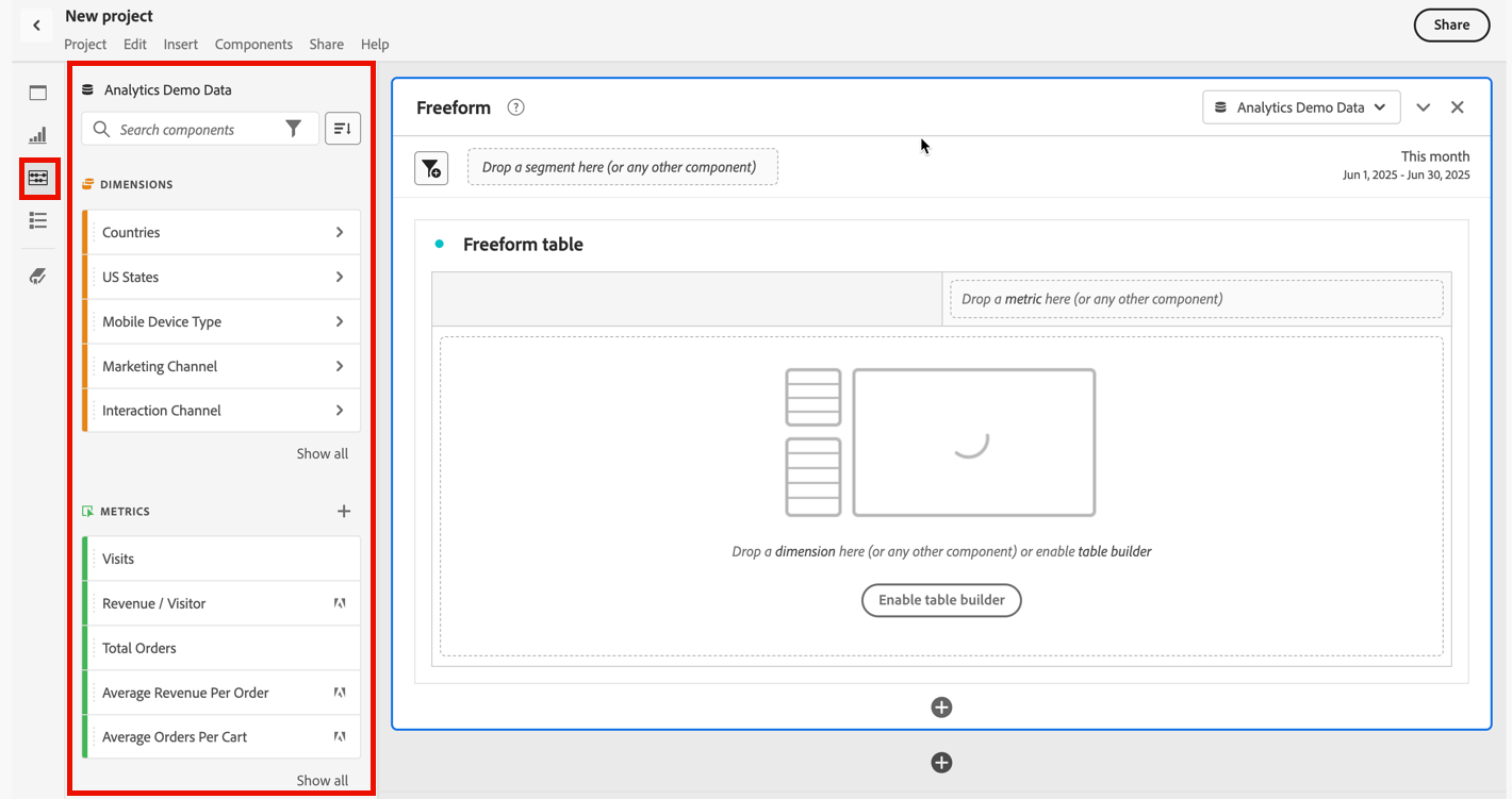 VRS에 포함할 구성 요소(차원, 지표, 세그먼트 또는 날짜 범위)를 포함 구성 요소 섹션으로 끌어다 놓습니다.