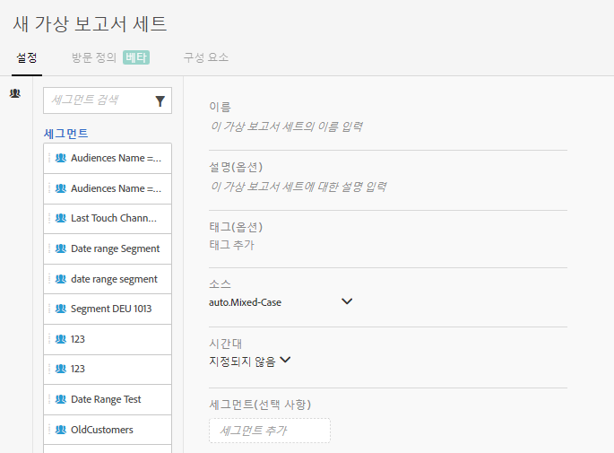 | 세그먼트 | 한 개 세그먼트를 추가하거나 세그먼트를 스택할 수 있습니다. 참고: 2개의 세그먼트를 스택할 때 AND 문으로 연결됩니다. 이것을 OR 문으로 변경할 수 없습니다. 현재 가상 보고서 세트에 사용된 세그먼트를 삭제하거나 수정하려고 하면 경고가 표시됩니다. |