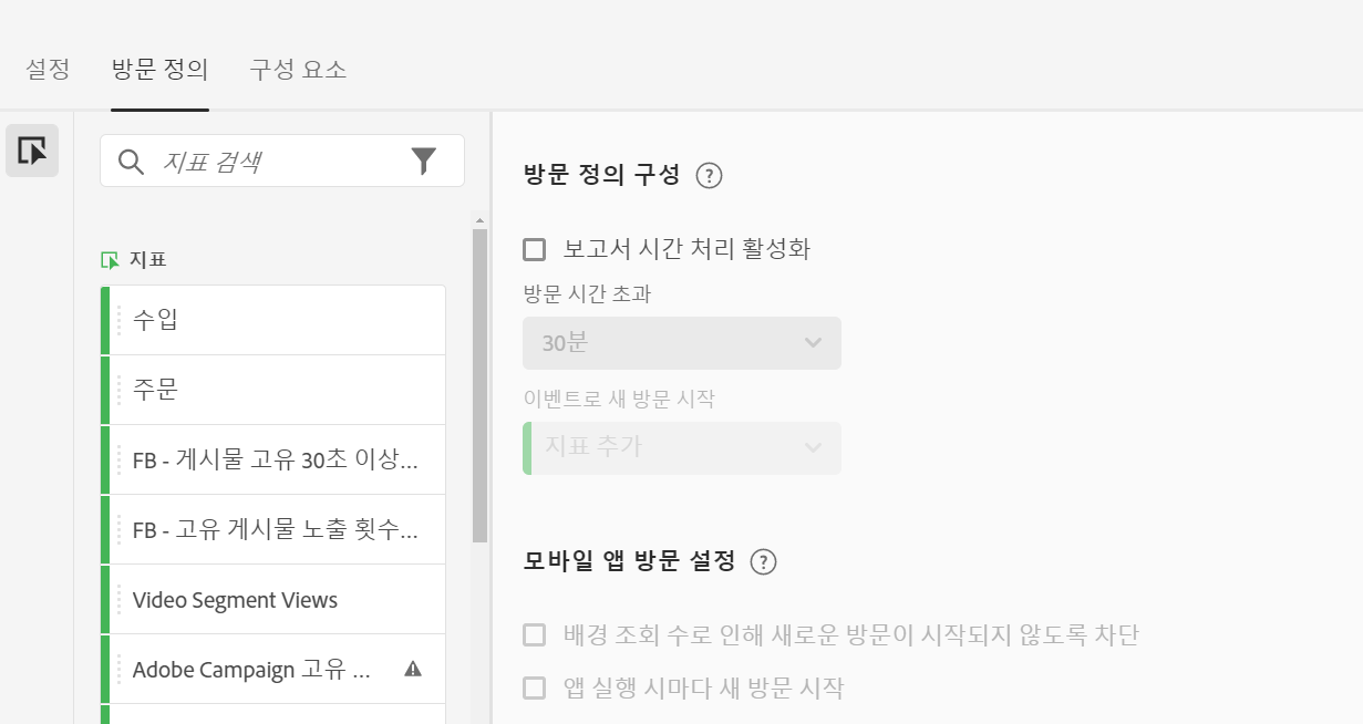 | 모바일 앱 방문 설정 | Adobe의 Mobile SDK에서 수집한 모바일 앱 조회수에 대해 방문 횟수가 정의되는 방식을 수정합니다. 이러한 설정은 비파괴적이며 Analysis Workspace에만 적용됩니다. |