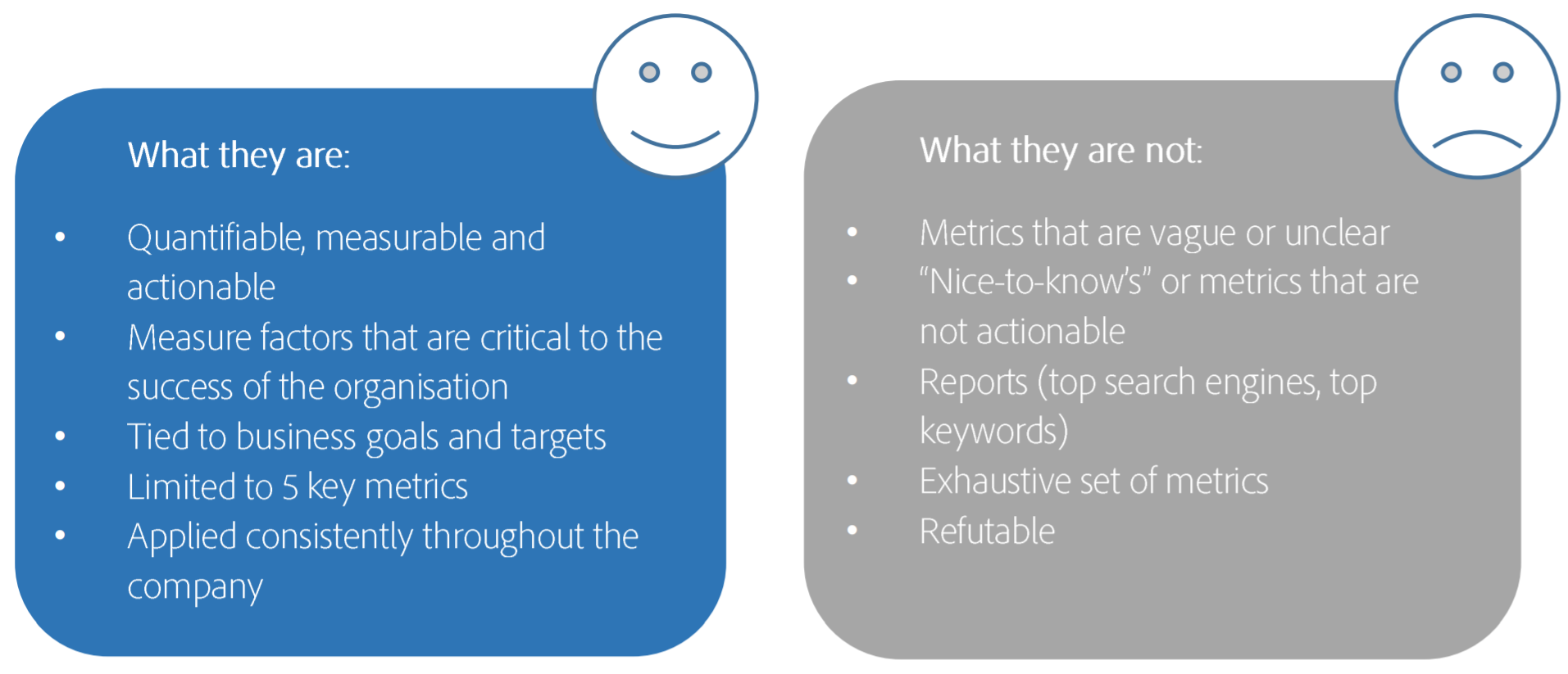 스스로에게 질문해 보십시오. 만약 CEO가 섬에 갇혀 있고 사업 건전성에 대해 오직 5가지만 말할 수 있다면, 무엇을 말하시겠습니까? 페이지에 머문 평균 시간이 1시 30분이라고 말하는 것은 전혀 도움이 되지 않을 것입니다. 그러나 평균 방문자당 매출이 $2.00이고 방문수가 2백만이라고 말한다면 진정한 비즈니스 성공의 지표를 CEO에게 제시할 수 있을 것입니다.