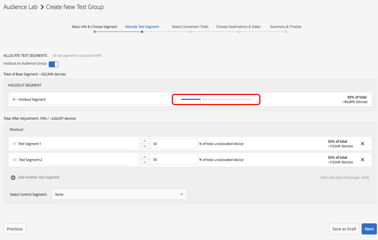 슬라이더를 사용하여 테스트에서 보류할 장치 수를 조정합니다. 이제 테스트 세그먼트 1과 테스트 세그먼트 2가 전체 장치의 70%만 만드는 방법을 확인하십시오.