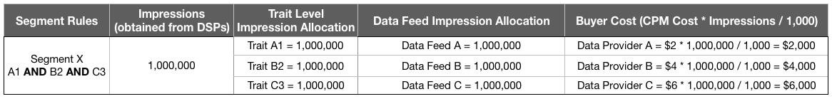 No podemos decir qué rasgo es responsable de un impresión porque la calificación se basa en una OR condición. Como resultado, en la Audience Marketplace > Payables sección acredita a cada proveedor con un Asignación ponderado de las impresiones totales, basado en la población de rasgos.