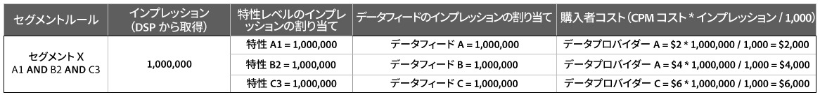 セグメントレベルで CPM の使用状況を報告すると、Audience Marketplace により、CPM データフィードのコスト配分に基づいて、対応するデータフィードに正確な使用状況が自動的に割り当てられます。