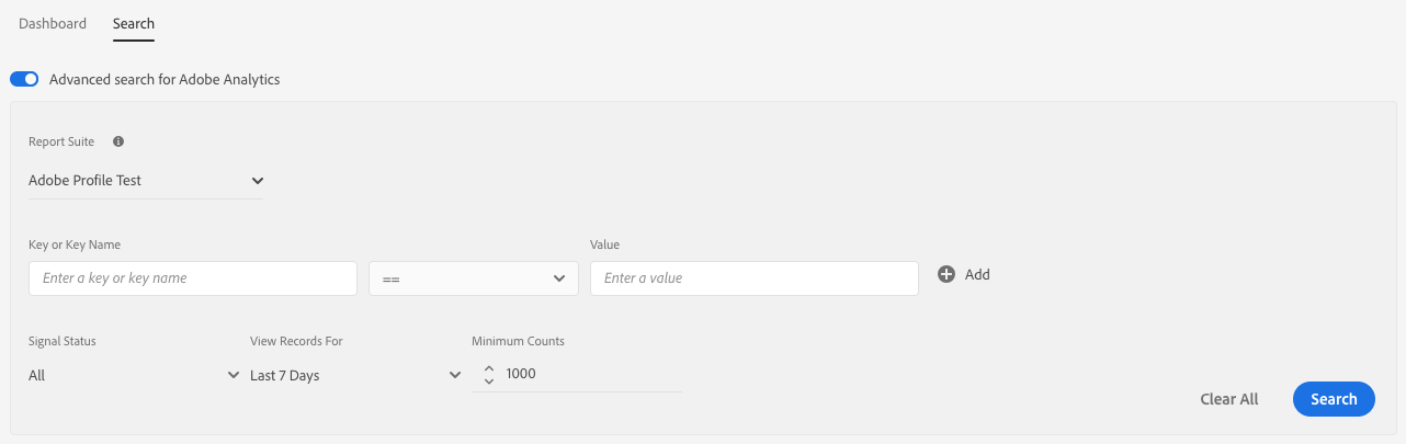 Audience Data > Signals > Search (으)로 이동하여 Signals Search 옵션을 실행하고 Advanced search for Adobe Analytics 옵션을 활성화합니다.