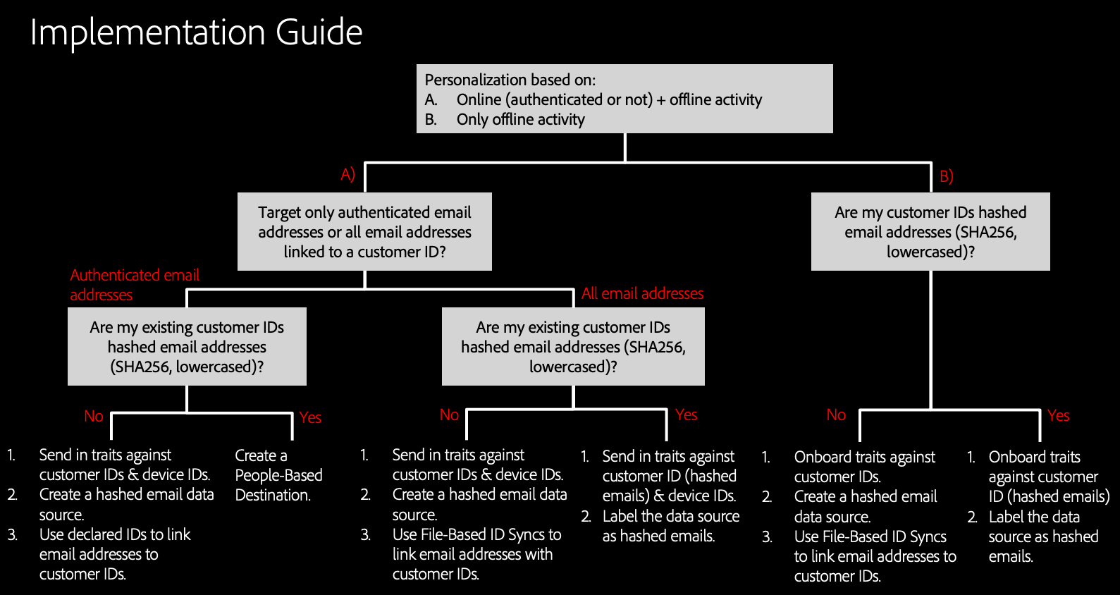People-Based Destinations 은 고객 데이터의 구성 방식에 따라 다양한 구현 전략을 제공합니다. 이 문서에서는 시나리오에 따라 People-Based Destinations에 대해 수행해야 하는 구현 단계에 대한 개요를 제공합니다.