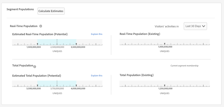 예상 세그먼트 모집단 데이터(실시간 및 총)의 경우 세그먼트에서 트레이트를 추가하거나 제거할 때 Segment Builder이 자동으로 그래프를 업데이트하지 않습니다. 예상 모집단 수를 보거나 새로 고치려면 Calculate Estimates 을 클릭합니다.