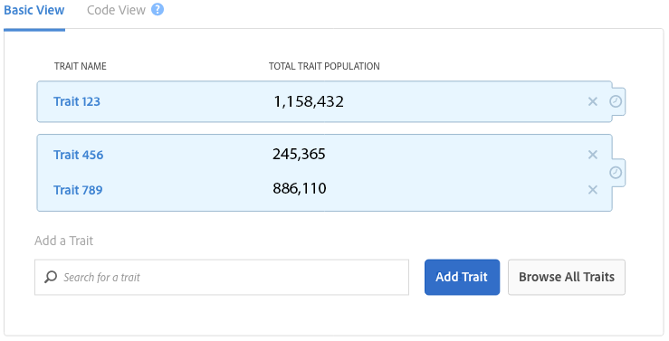 Segment Builder 세그먼트 Total Trait Population 에 을(를) 추가할 마지막 날 trait 에 대한 을(를) 표시합니다. 이 데이터는 Basic View 섹션에서 선택한 trait 주위의 파란색 필드에 나타납니다.