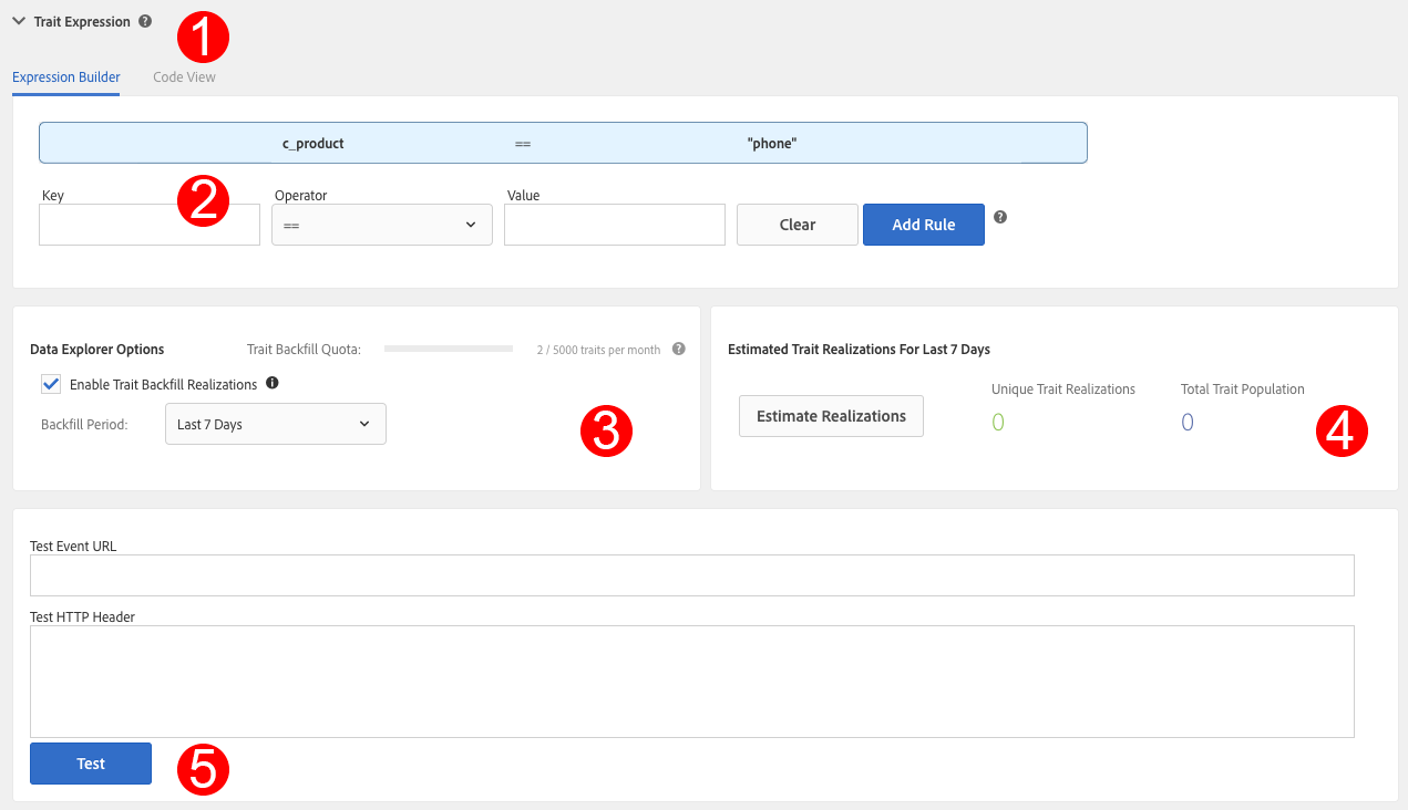 Trait Builder에서 Expression Builder을 사용하여 대상 자격 요구 사항을 설정하는 규칙을 만들고 테스트할 수 있습니다. 규칙은 color == blue 또는 price > 100과 같은 키-값 쌍으로 구성됩니다. 비교 연산자는 키와 값 간의 관계를 설정합니다. Boolean 표현식은 규칙 그룹 간의 관계를 결정합니다.