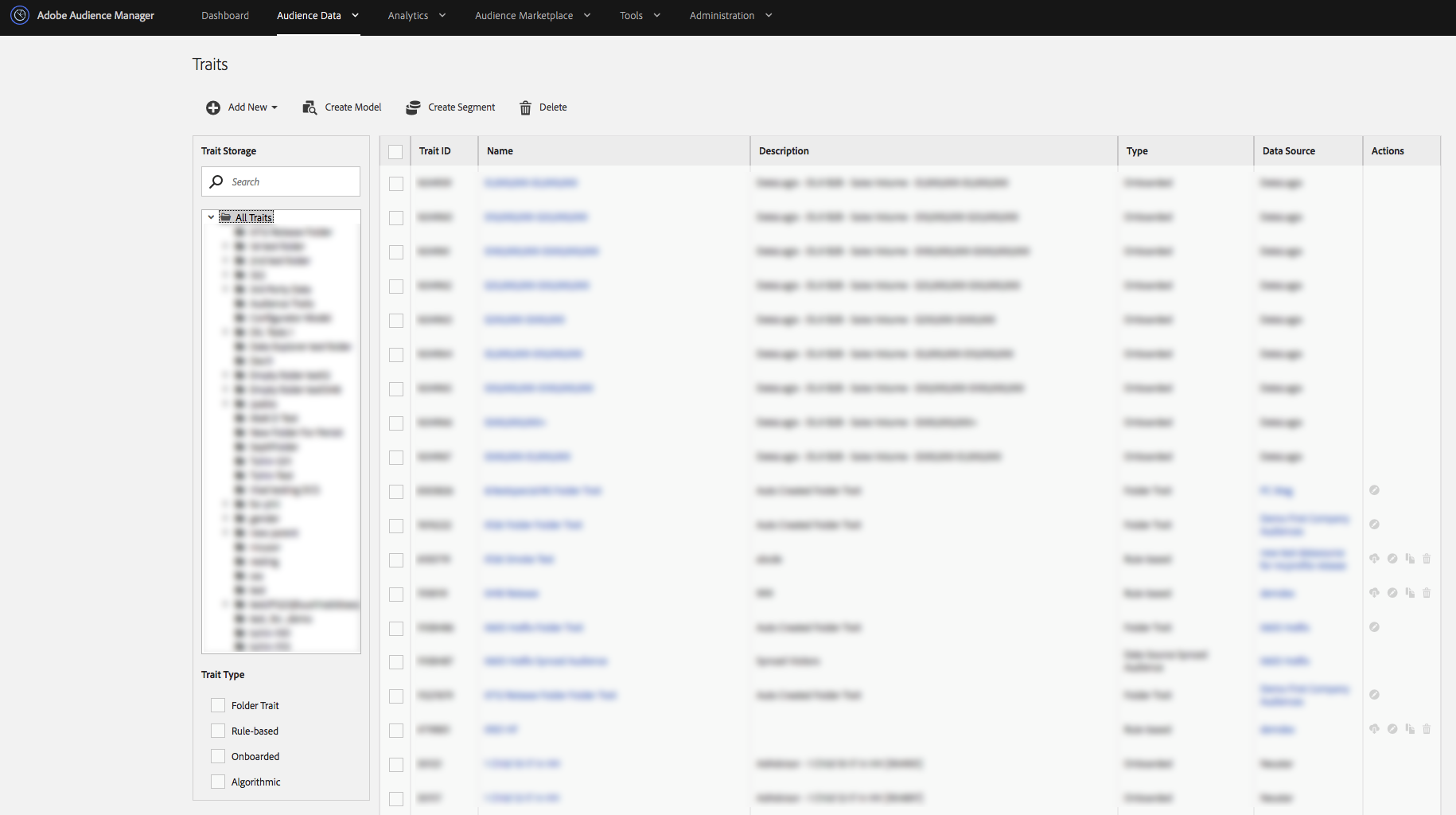 트레이트 대시보드는 트레이트를 관리하기 위한 중앙 집중식 작업 공간입니다. Audience Data > Traits(으)로 이동하여 Traits 대시보드를 볼 수 있습니다.