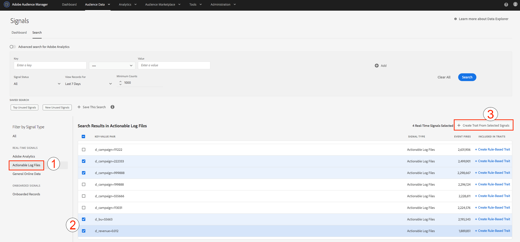 실행 가능한 신호를 사용하여 규칙 기반 트레이트를 만들려면 을 선택합니다 실행 가능 로그 파일 (1) 트레이트 규칙(2)으로 사용할 동작 가능한 신호를 선택하고 키를 누릅니다 선택한 신호에서 트레이트 만들기 (3).