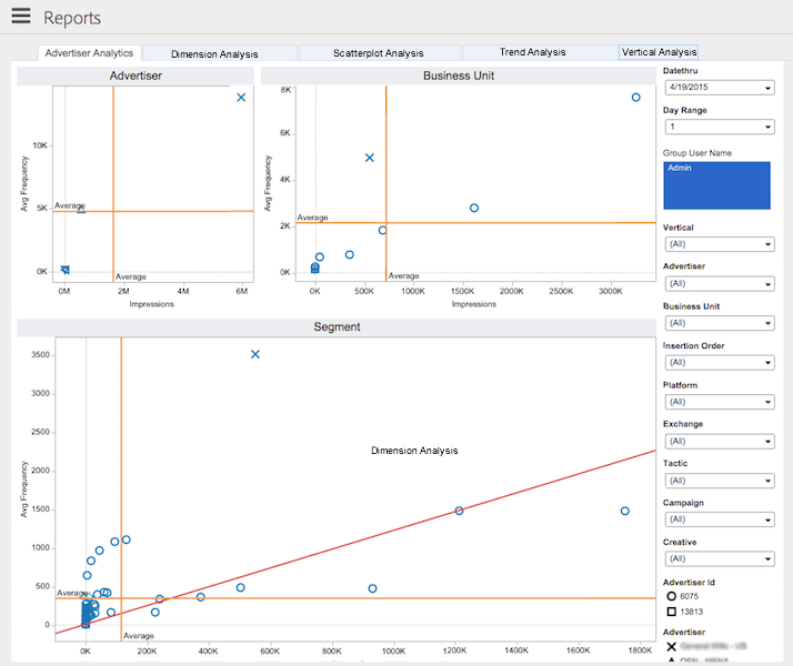 Audience Manager은(는) Tableau을(를) 사용하여 대화형 보고서 및 Audience Optimization 보고서에 데이터를 표시합니다. 대화형 보고서는 성능을 표시하며 트레이트 및 세그먼트에 대한 데이터와 겹칩니다. 열과 행에 정렬된 숫자를 사용하는 대신 서로 다른 모양, 색상 및 크기를 사용하여 데이터를 반환합니다. 또한 개별 또는 데이터 포인트 그룹을 선택하고 보고서 결과를 드릴다운하여 자세한 내용을 확인할 수 있습니다. 이러한 시각화 기술과 보고서 상호 작용성은 대량의 숫자 데이터를 더 쉽게 이해할 수 있도록 해줍니다.