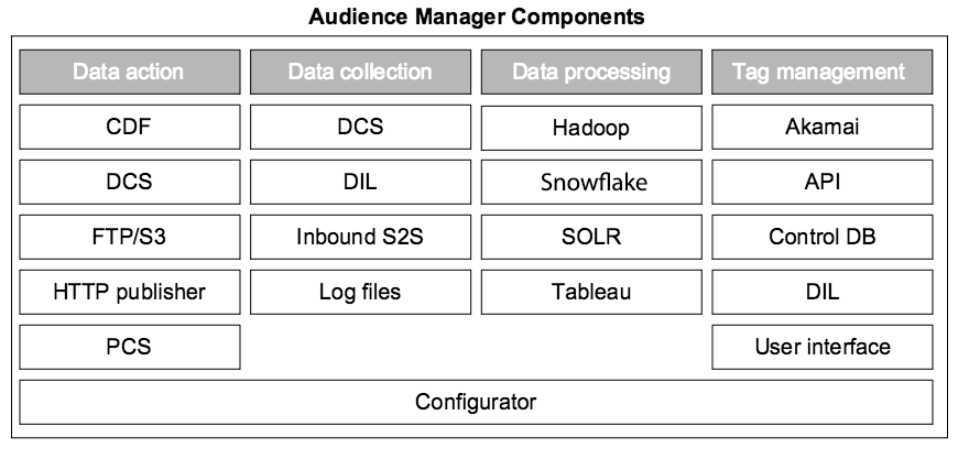 다음 그림은 Audience Manager을(를) 지원하는 기본 구성 요소와 기본 기술(하드웨어 및 소프트웨어)을 보여 줍니다. 일부 프로세스에서는 특정 기능을 수행하고 다른 프로세스에는 다목적 역할이 있지만 모든 시스템은 함께 작동하여 태그를 관리하고, 데이터를 수집하고, 성능을 분석하고, 정보를 다른 시스템과 동기화하고, 해당 정보에 대한 조치를 취하는 데 도움이 됩니다.