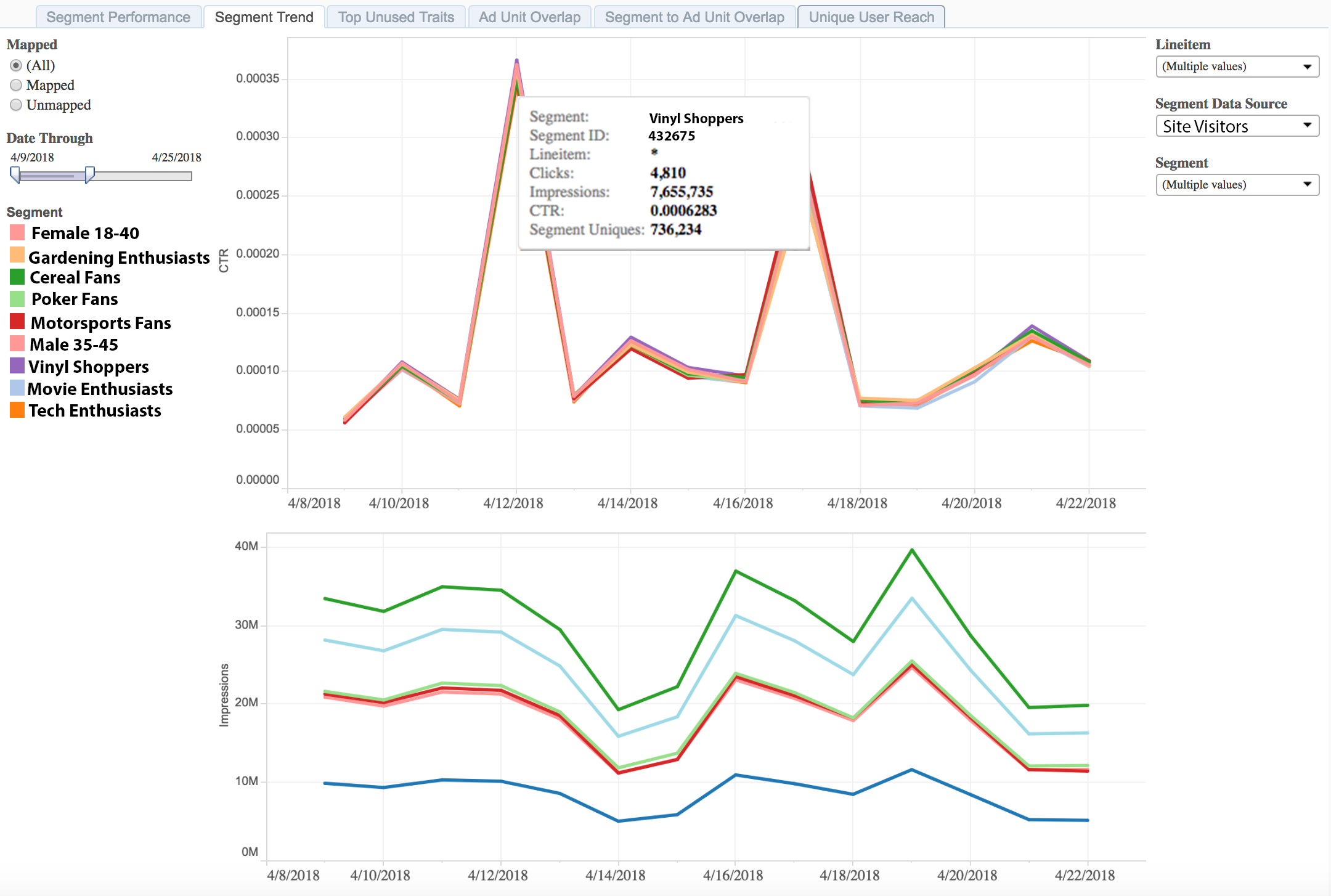 세그먼트 트렌드 보고서는 시간에 따른 매핑된 세그먼트와 매핑되지 않은 세그먼트의 노출 횟수 및 클릭스루 비율에 대한 데이터를 반환합니다.