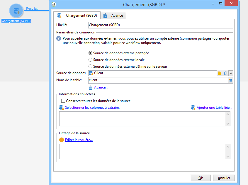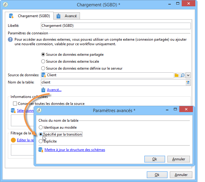 Le nom de la table saisi dans le champ correspondant sert de modèle pour collecter les données dans la base externe. Le nom de la table qui sera effectivement traitée par le workflow peut être calculé ou véhiculé par la transition entrante de l'activité de chargement. Pour choisir la table à utiliser, cliquez sur le lien Avancé…. et sélectionnez l’option Spécifié par la transition ou Explicite.