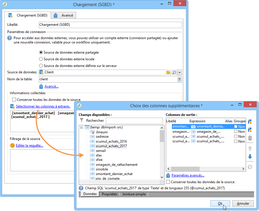 Cliquez sur le lien Sélectionner les colonnes à extraire… afin de choisir les données qui doivent être collectées dans la base.