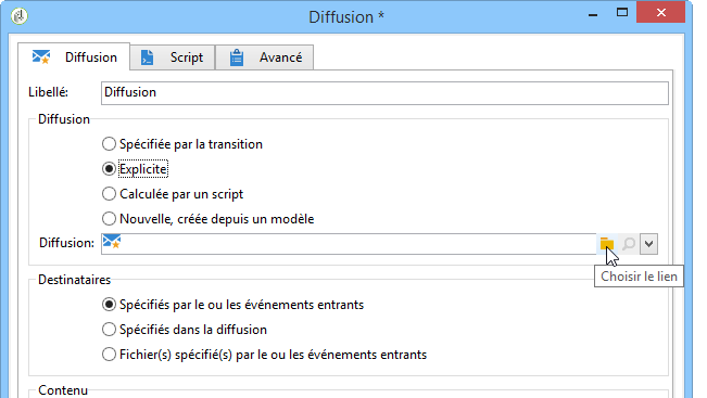 Une fois l'action de diffusion sélectionnée, vous pouvez en visualiser le contenu en cliquant sur l'icône Editer le lien.