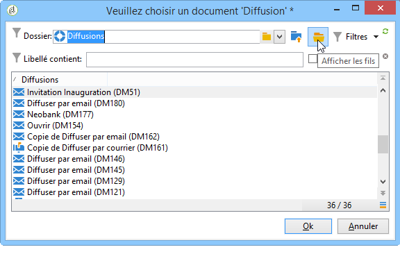 Sélectionnez le dossier visé dans la liste déroulante du champ Dossier ou cliquez sur Afficher les fils pour afficher toutes les diffusions contenues dans les sous-dossiers :