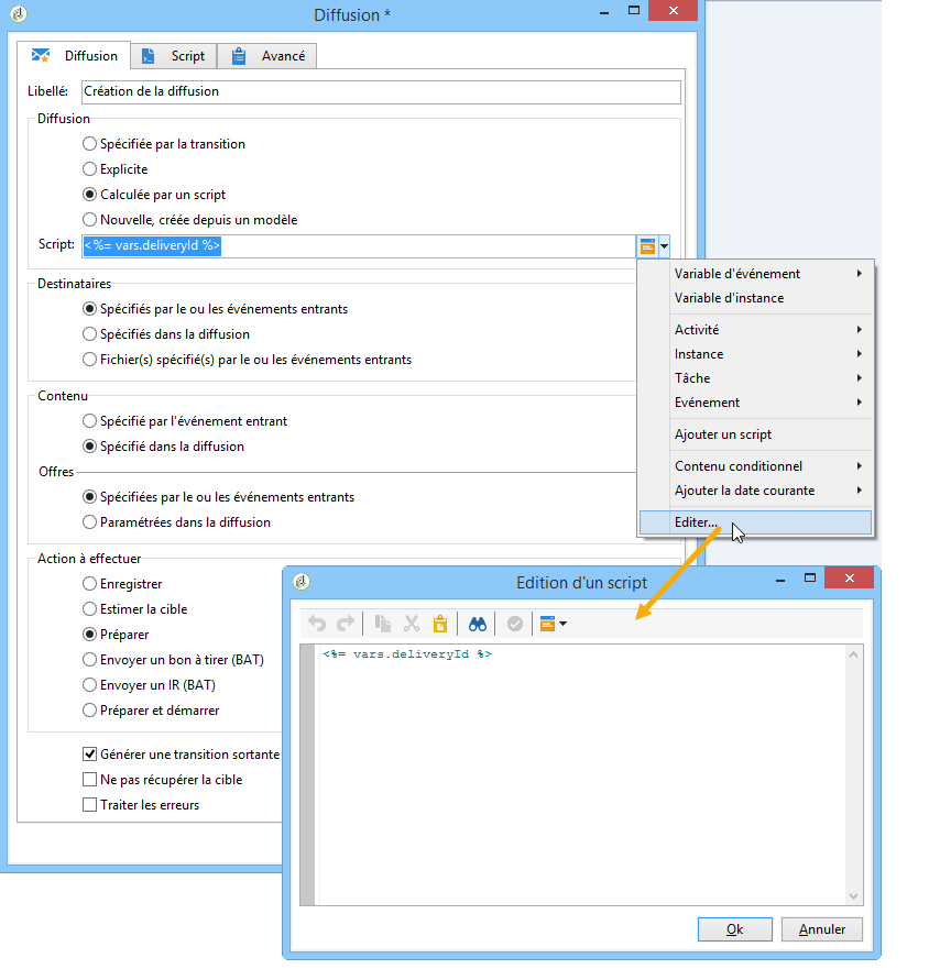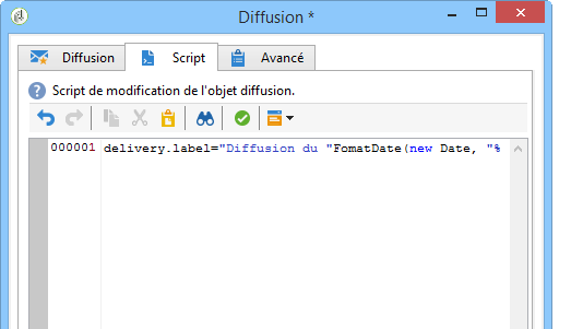 Créez un script pour calculer la diffusion. Pour cela, sélectionnez l’option Calculée par un script et saisissez le script. Vous pouvez ouvrir une fenêtre de saisie en cliquant sur Éditer…. L’exemple suivant permet de récupérer l’identifiant de la diffusion :