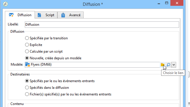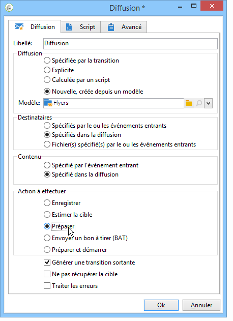 Cliquez sur OK pour fermer la fenêtre de propriétés. Vous venez de configurer une activité consistant à créer et préparer une nouvelle diffusion depuis un modèle de diffusion dont la cible sera celle spécifiée dans le modèle.