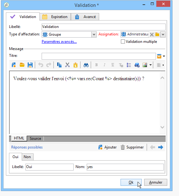 Il s’agit d’un message incluant une expression JavaScript : l’expression vars.recCount représente le nombre de destinataires ciblés par la diffusion de la tâche qui précède. Pour plus d’informations sur les expressions JavaScript, voir la section Scripts/Templates JavaScript.
