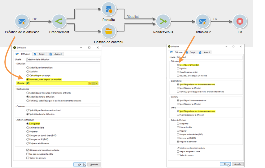 Dans l'exemple suivant, la diffusion est créée dans un premier temps. La population et le contenu sont définis ensuite. Enfin, les informations de ces trois éléments sont reprises dans une nouvelle activité de diffusion via la transition entrante, afin que cette dernière puisse être envoyée.