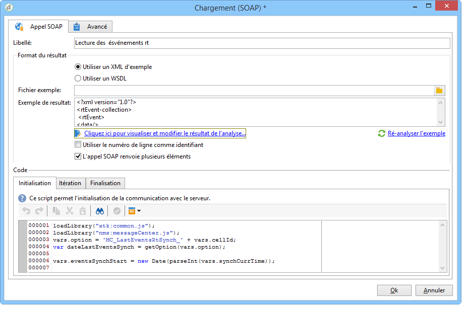 Dans le cas d'un XML d'exemple, sélectionnez un fichier d'exemple. Le fichier est analysé afin d'établir un exemple de résultat.