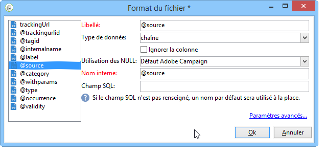 Vous pouvez également personnaliser les mises en forme des données des colonnes via le lien Paramètres avancés. Pour plus d'informations à propos de la mise en forme de données importées, consultez cette section.